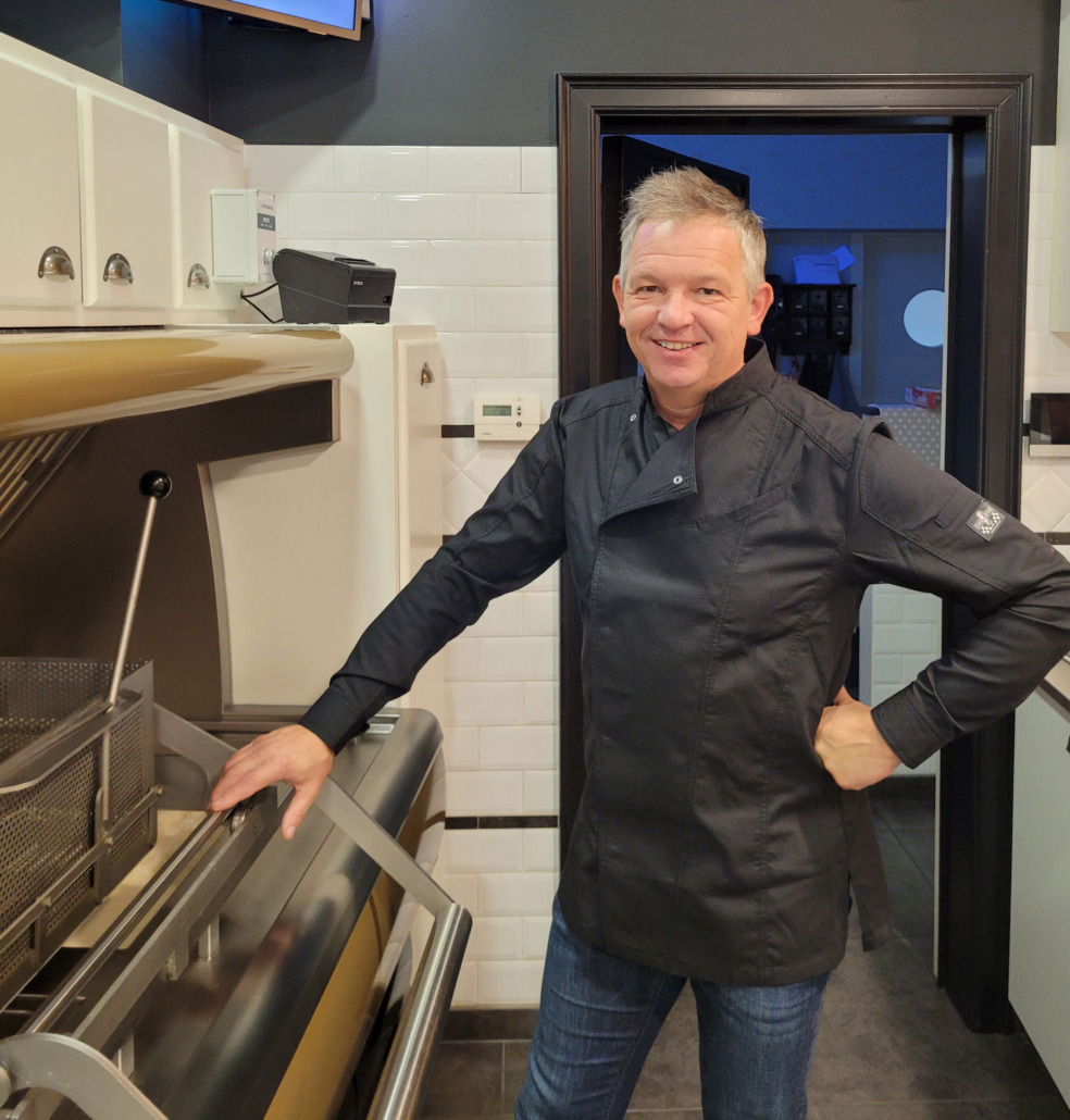 Met de nieuwe transferfriteuse kunnen we tien kilo friet voorbakken en in twee seconden uit het vet halen. Dit systeem heeft me van mijn schouderklachten afgeholpen. Mijn vrouw en ik kunnen nu alles met z’n tweeën aan, zelfs grote bestellingen. Het geeft ons meer continuïteit en snelheid in de zaak.